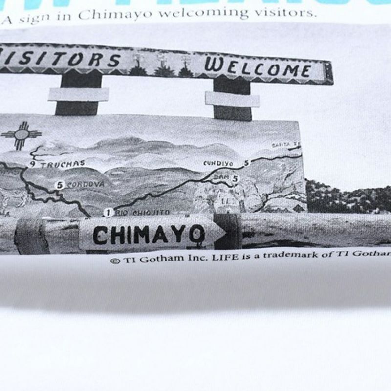 ニューメキシコ州北部のチマヨに当時あった、味のある観光向けの看板についてのグラフィックをプリントしたデザインです。