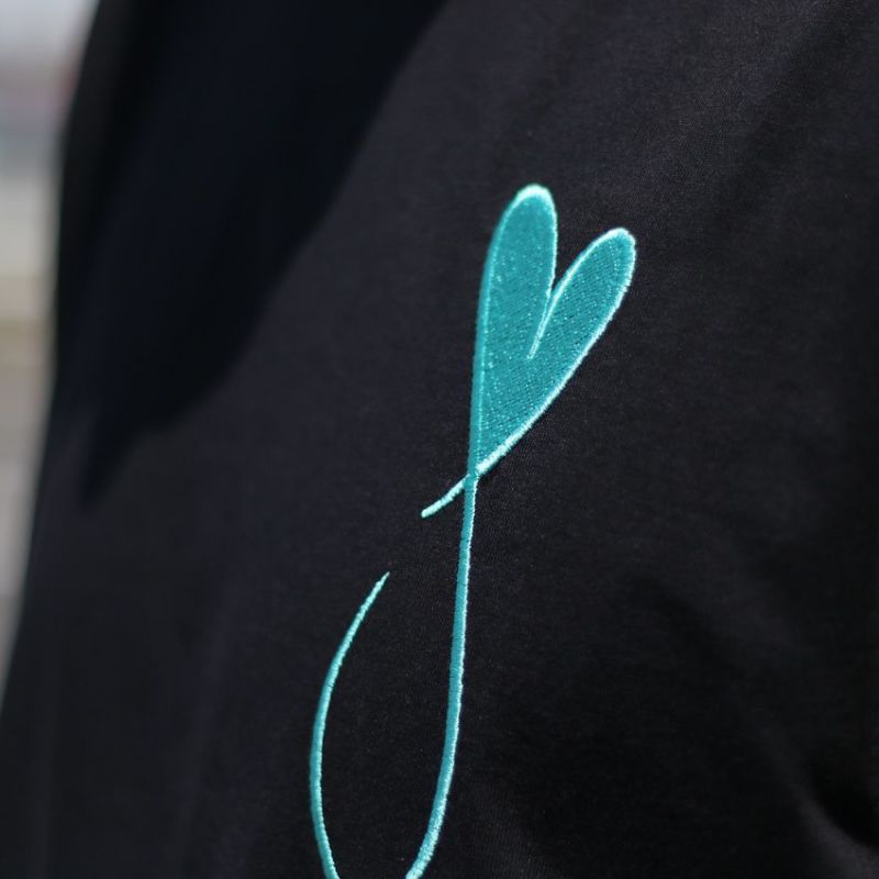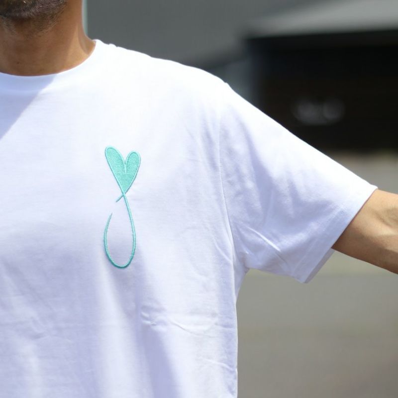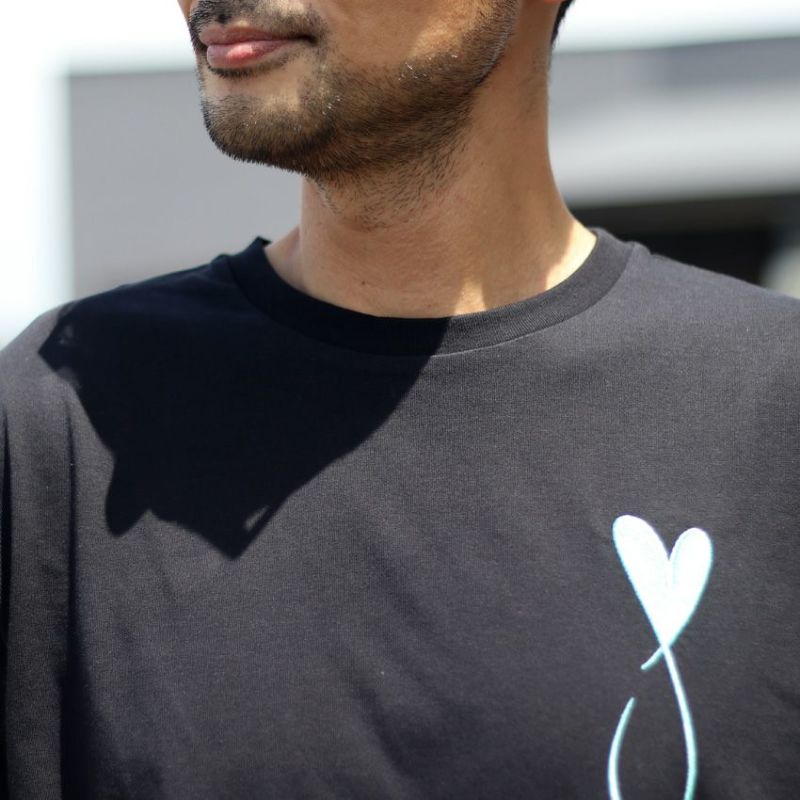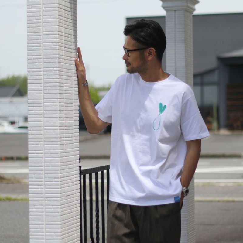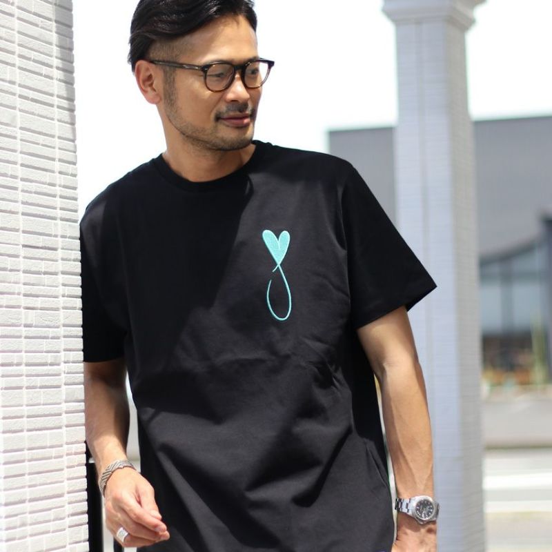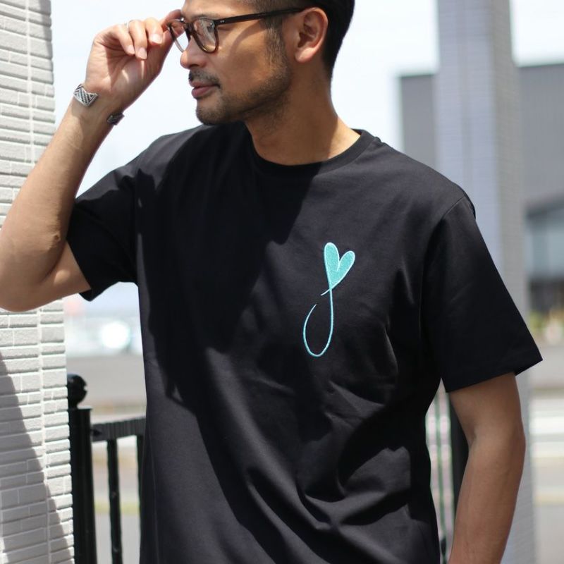印象的なブルーのハートフィッシュ刺繍が目を引く、ワンランク上の大人Tシャツ。