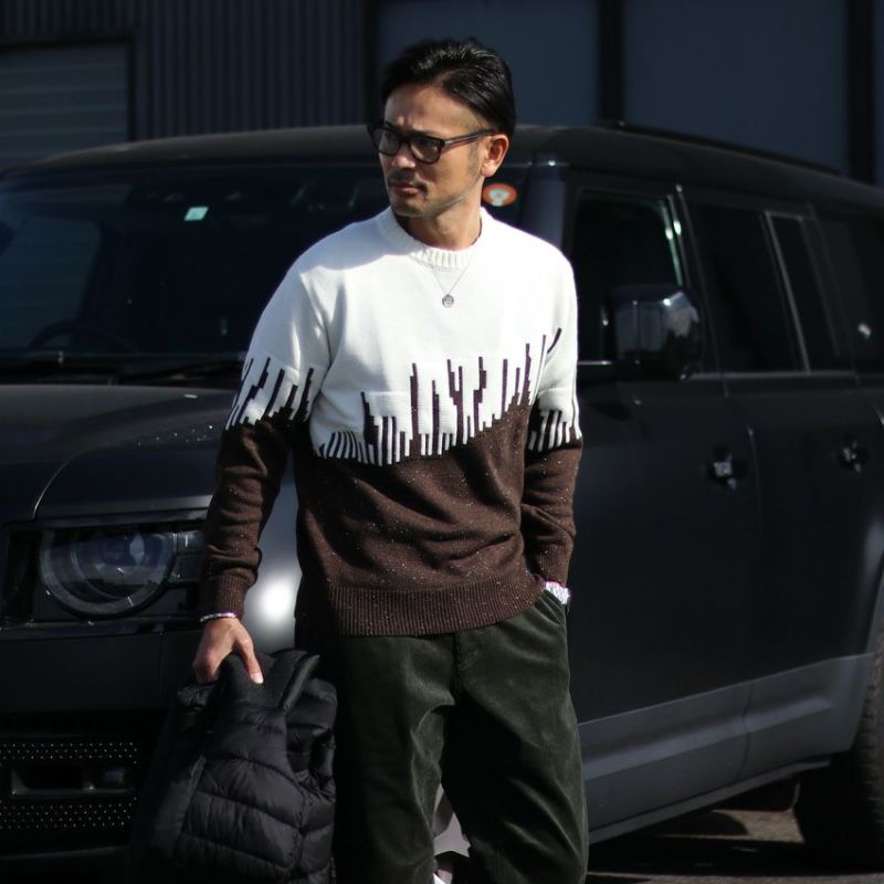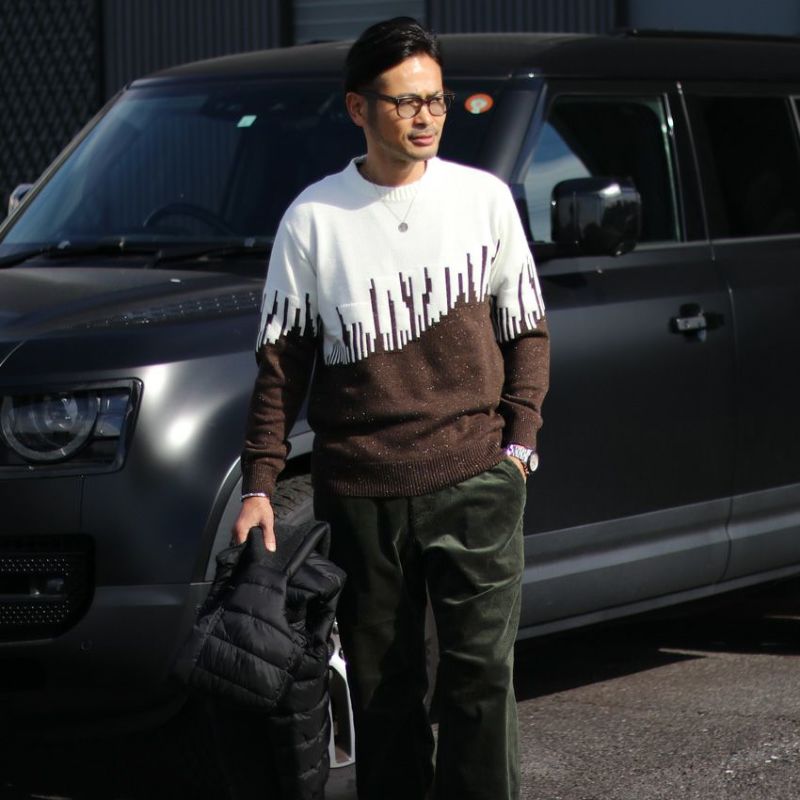 シンプルなパンツに合わせるだけで主役になるデザインニット。