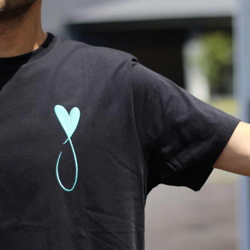 印象的なブルーのハートフィッシュ刺繍が目を引く、ワンランク上の大人Tシャツ。