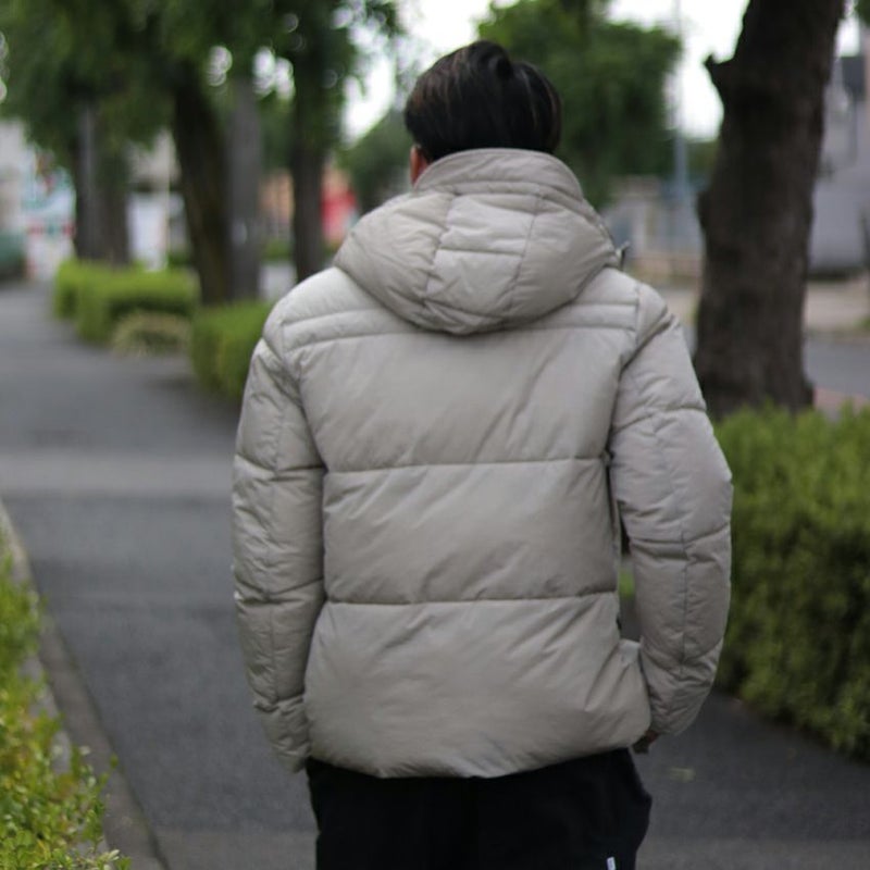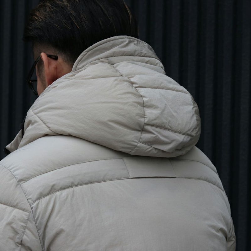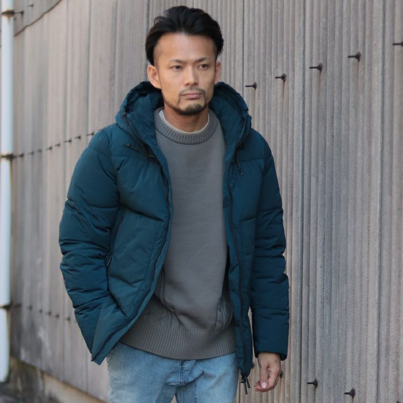 弱光沢で凹凸のある生地が、きれいな雰囲気の中綿ダウンジャケット。