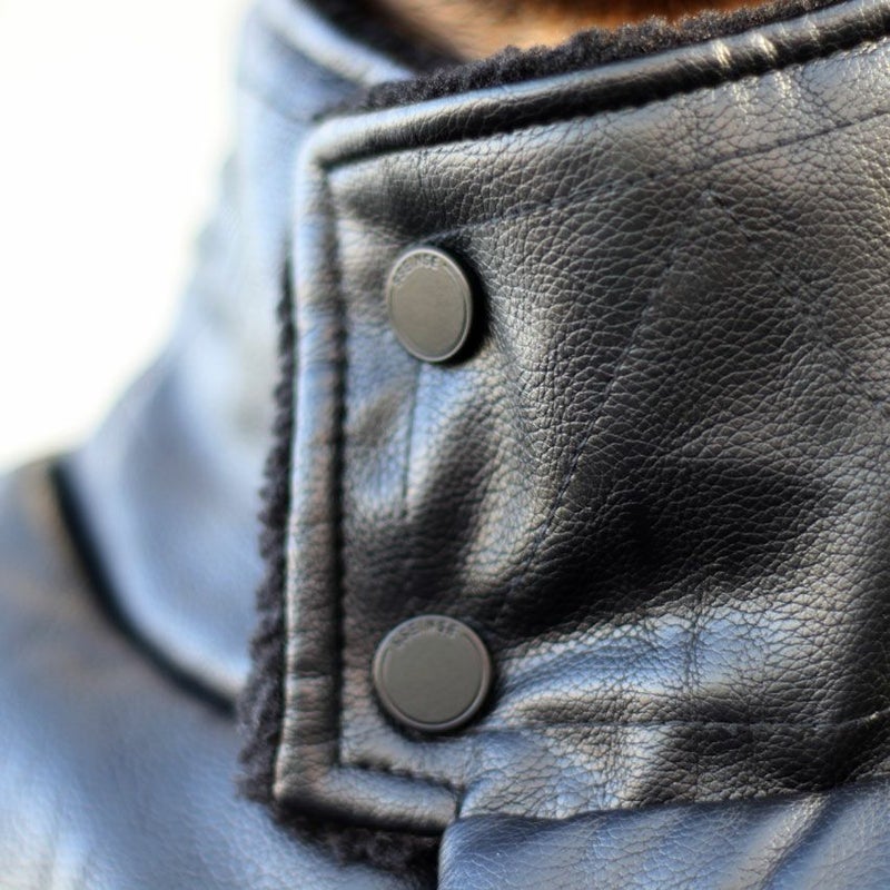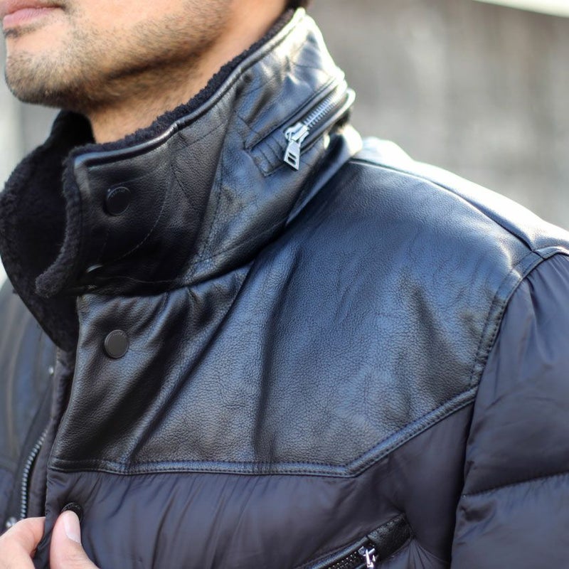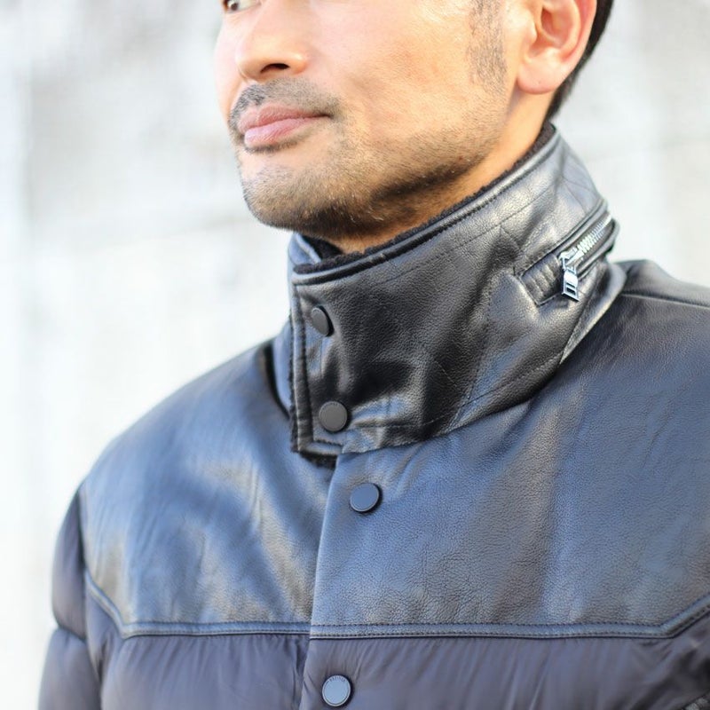 身頃を大胆にエコレザーで切り替えたスタンドカラーの中綿ブルゾン。
