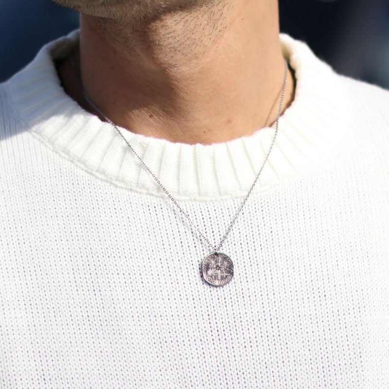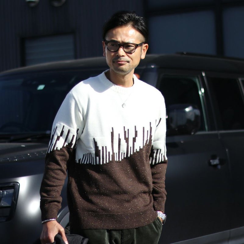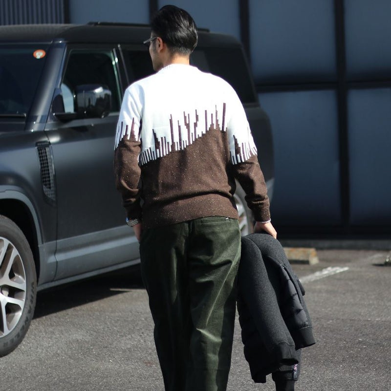 シンプルなパンツに合わせるだけで主役になるデザインニット。