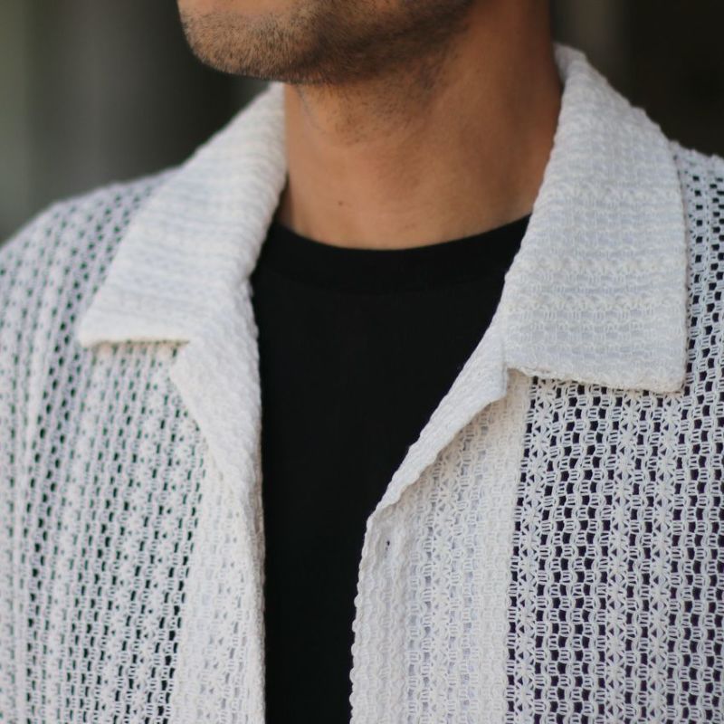 オリジナルの編み立てデザインが映えるメッシュ開襟シャツ。