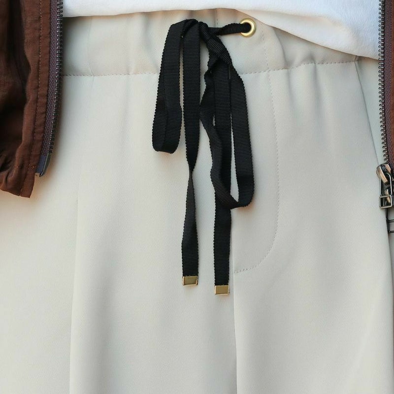ウエストのドローコードはゴールドの金属パーツがアクセント。